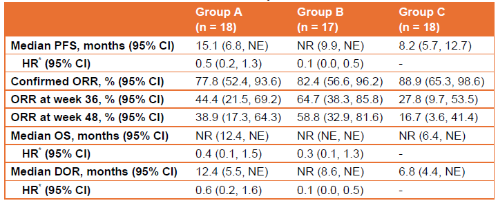 截至2023年7月30日(数据截止日期),53例患者被随机分配至A组(n = 18)、B组(n = 17)和C组(n = 18),中位随访时间为14.3个月。44(83.0%)例患者为男性。主要疗效结果见表1。表1中报告的肿瘤评估由IRRC进行。各组分别有18(100.0%)例、16(94.1%)例和17(94.4%)例患者发生治疗相关不良事件(TRAE)。A组、B组和C组各有5(27.8%)例、1(5.9%)例和1(5.6%)例患者发生严重TRAE。仅C组有1(5.6%)例患者报告了5级TRAE。