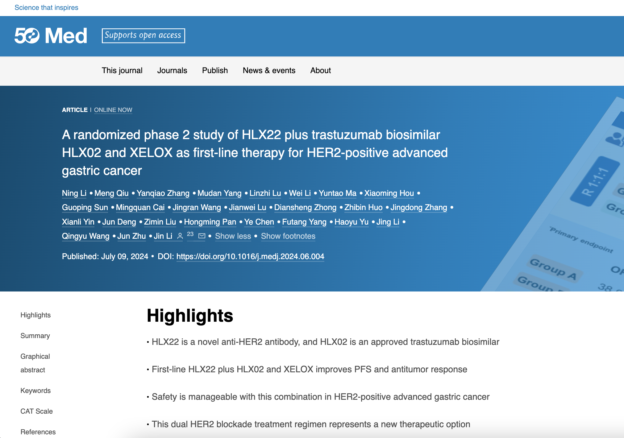 近期,由上海市东方医院李进教授担任主要研究者的创新型抗HER2单抗HLX22联合汉曲优®(HLX02,曲妥珠单抗,美国商品名:HERCESSI™️,欧洲商品名:Zercepac®)和化疗用于一线治疗HER2阳性晚期或转移性胃/胃食管交界部(G/GEJ)癌的II期临床研究(HLX22-GC-201)结果相继于2024年欧洲肿瘤学会胃肠道肿瘤研讨会(ESMO GI)和Cell Press细胞出版社旗下的综合性医学旗舰期刊MED发布。研究结果显示,在HLX02(曲妥珠单抗)联用化疗的基础上加入HLX22可明显改善HER2阳性G/GEJ癌患者一线治疗的效果,且安全性可控。
