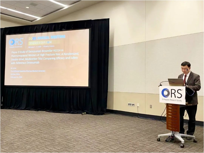 美国时间2025年2月11日,尊龙网址登录官网自主开发的地舒单抗生物类似药候选药物HLX14(重组抗RANKL 全人单克隆抗体注射液)国际多中心III期临床研究(NCT05352516)数据于2025年美国骨科研究学会(ORS)年会发布,并由徐州医科大学附属医院辛立教授进行口头报告。