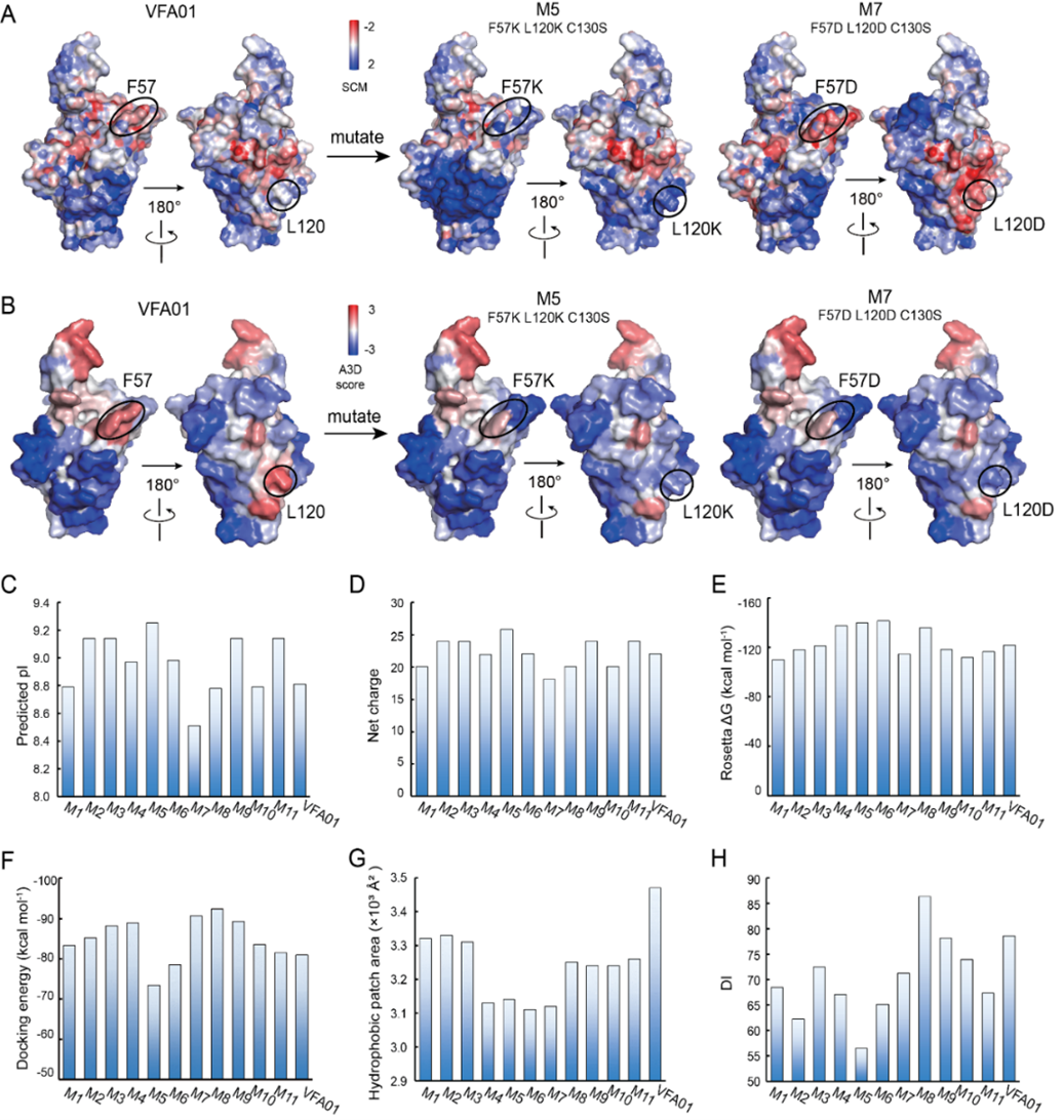 通过进一步的结合肽图分析,研究人员确认了五个关键稳定性热点氨基酸:C130、F57、Y106、L120和W111。基于这些发现,研究团队对VFA01进行了系列变体设计,最终获得经实验验证的高稳定性变体M11(C130S/W111F/F57K)。与原抗体VFA01相比,变体M11的稳定性显著提升:亚微米级蛋白颗粒的聚集速率降低了6.2倍,100nm及以下蛋白颗粒的聚集速率降低了3.4倍,蛋白裂解速率降低了1.5倍;而且,M11的抗原结合亲和力和蛋白质产量均提升了1.5倍。因此,该研究为VHH-Fc类融合抗体的开发提供了一条有效的稳定性优化途径。