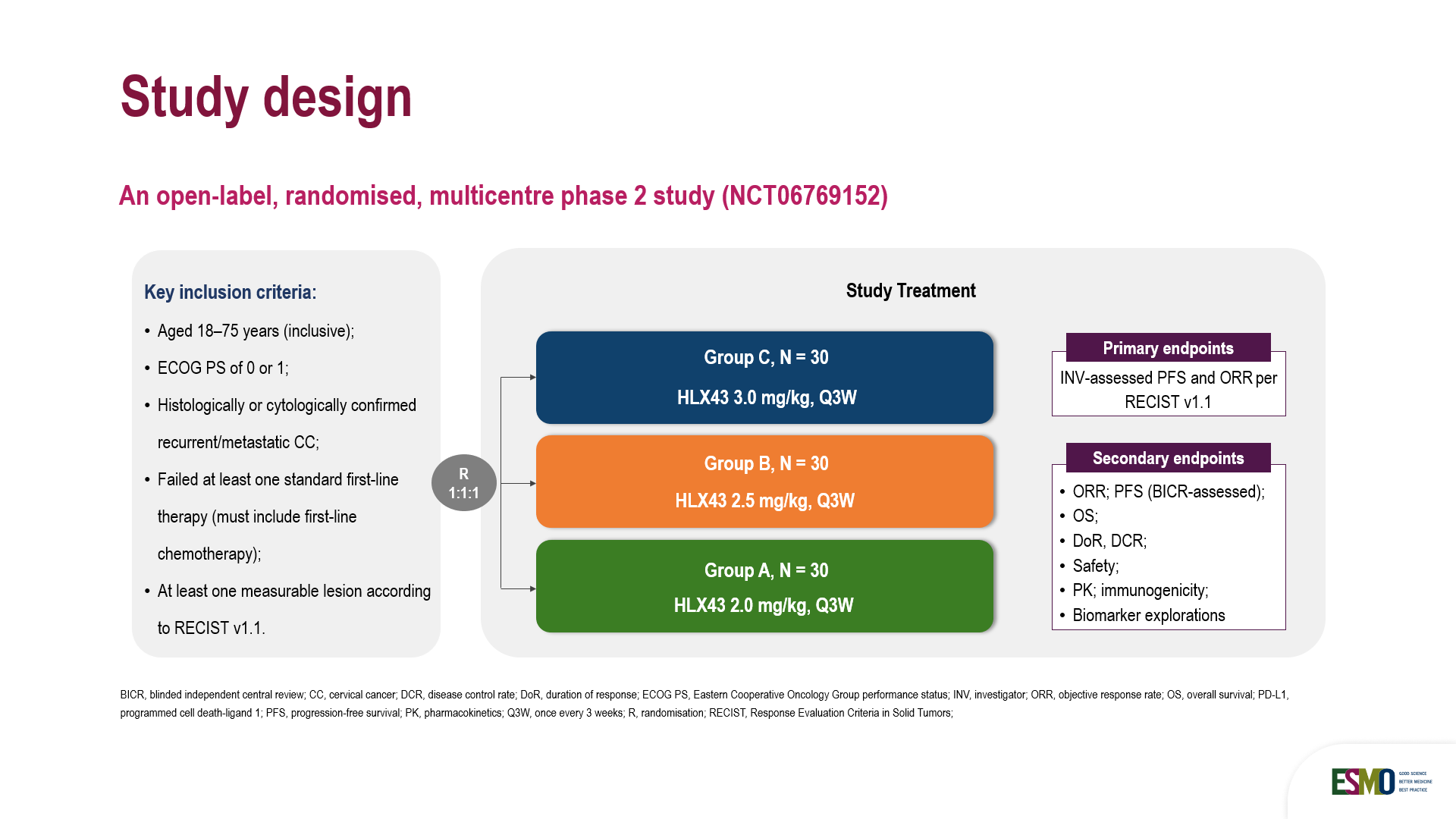 本次發佈基於一項開放、隨機、多中心的II期臨床研究,由山東省腫瘤醫院於金明院士牽頭開展。經組織學確診為復發/晚期宮頸癌(CC)且既往接受過標準一線治療失敗、不耐受或禁忌的患者,按1:1:1比例隨機分組,每3周接受一次劑量為2 mg/kg、2.5 mg/kg或3 mg/kg的HLX43治療。主要終點為研究者根據RECIST v1.1評估的客觀緩解率(ORR)和無進展生存期(PFS)。次要終點包括其他有效性指標、安全性、藥代動力學、免疫原性和生物標誌物探索。