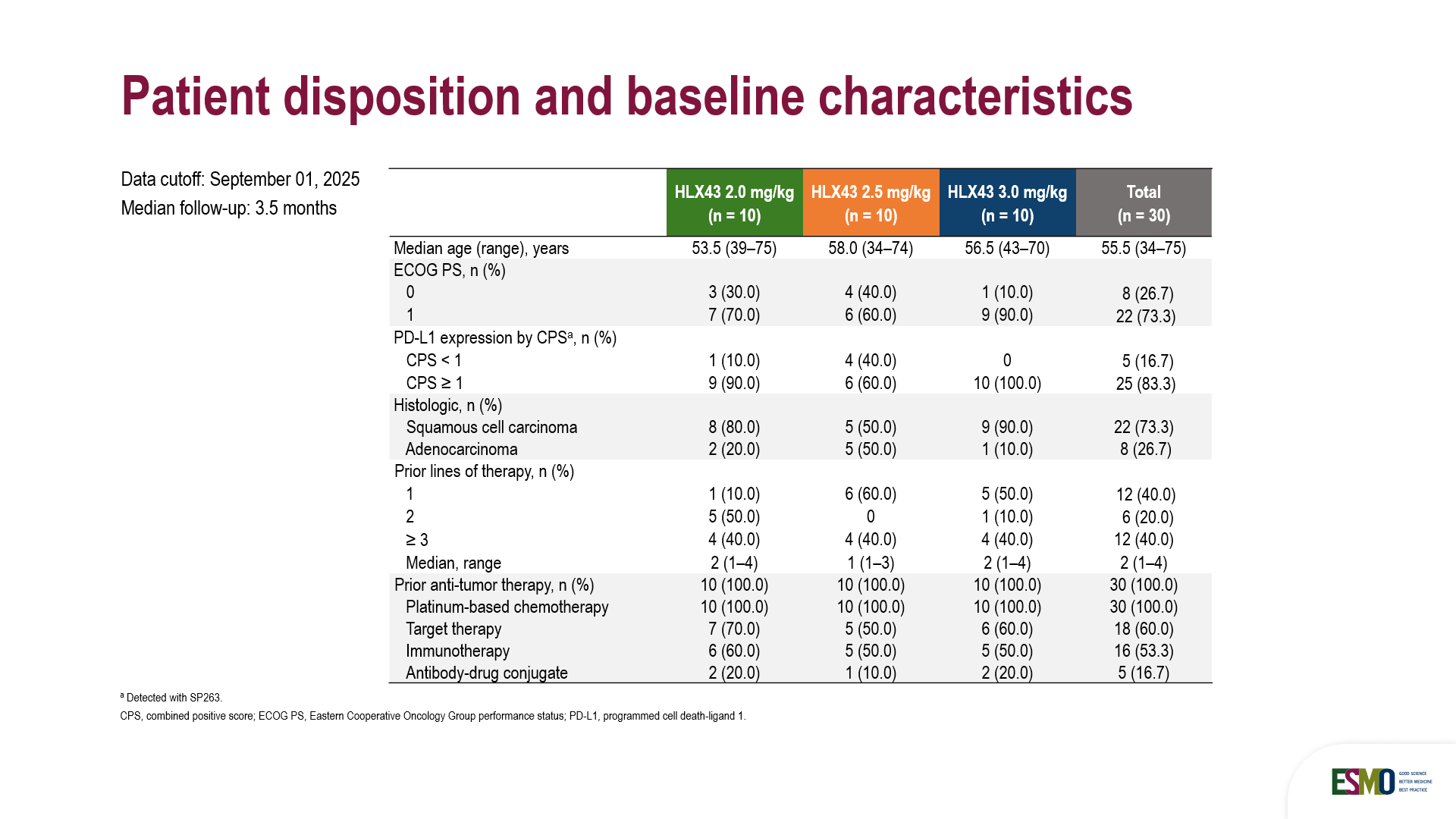 截至2025年9月1日,本研究共納入30例患者,隨機分配接受劑量為2 mg/kg(n=10)、2.5 mg/kg(n=10)和3 mg/kg(n=10)的HLX43治療。其中超過80%的患者PD-L1綜合陽性評分(CPS)≥1。 患者既往接受腫瘤治療的中位線數為2.0(範圍1–4線)。全部患者接受過鉑類藥物化療,60%的患者接受過靶向治療,約50%患者接受過免疫治療,中位隨訪時間為3.5個月。