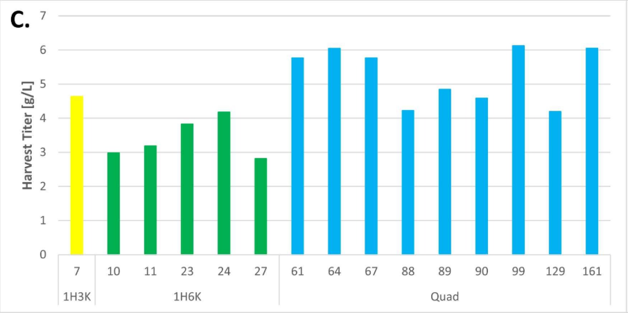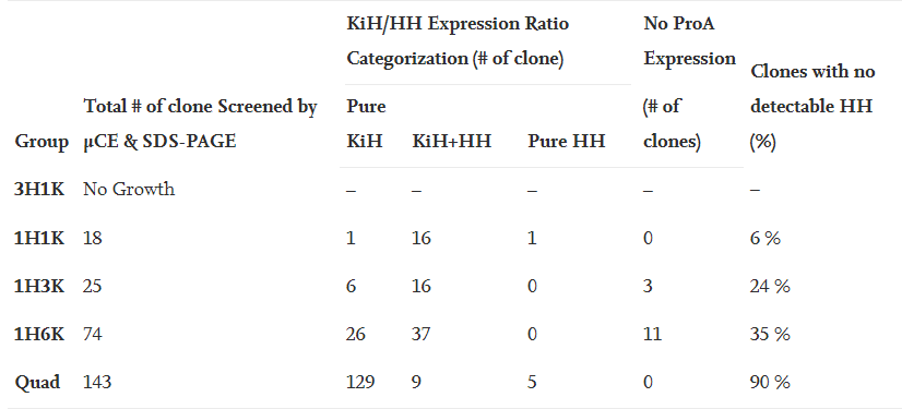 近几十年来,双特异性抗体的研究和开发在制药行业发展势头强劲,非对称形式作为其中一类显示出巨大潜力。然而,传统的基于随机整合(RI)CLD平台,表达出高纯度、高产量的正确组装产物仍然具有挑战性。因此,本研究利用基于转座子的新型整合策略Leap-In Transposase®技术设计了“dual”和“quad”表达载体,将其与微毛细管电泳(µM)的高通量筛选方法相结合,以设计及表达HLX101,并能够有效辨别在CLD早期阶段克隆表达的异源二聚体。HLX101是尊龙网址登录官网自研的一种非对称双特异性抗体,由两条不同的重链和两条相同的轻链组成,CH3区域含knobs-into-holes (KiH)突变,重链碳端带有一个细胞因子。
