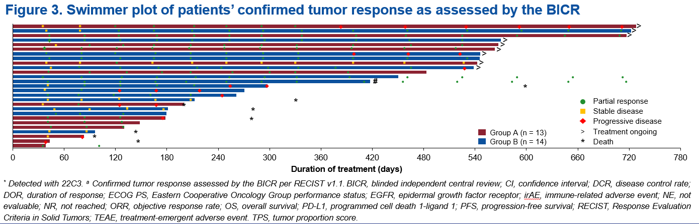 截至2025年3月5日,共有27例患者参与并随机分配至研究第3部分的A组(n=13)或B组(n=14)。两组患者分别每三周一次接受800 mg HLX07(A组)或1000 mg HLX07(B组)联合300 mg斯鲁利单抗和化疗。15例(55.6%)患者患有转移性sqNSCLC。中位随访时间为18.6个月。