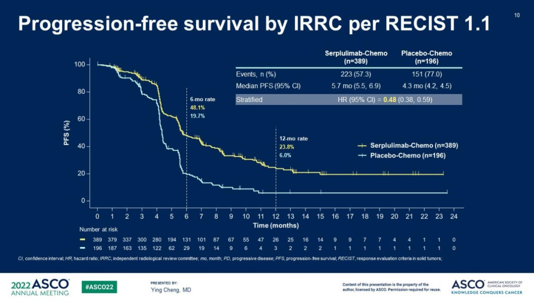 降低52%疾病進展或死亡風險:次要終點中,根據獨立影像評估委員會(IRRC)評估(RECIST 1.1標準)結果,兩組的PFS曲線也從早期(第2個月時)即持續分離(圖4),斯魯利單抗聯合組6個月和12個月PFS率分別達化療組的2.5倍和4倍(48.1%對19.7%,23.8%對6.0%),顯示出穩健、持久的腫瘤控制效果,降低疾病進展或死亡風險達52%(中位PFS:5.7個月對4.3個月,HR=0.48,95%CI:0.38~0.59)。