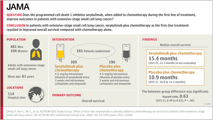 ASTRUM-005 is a randomised, double-blind, international, multi-centre, phase 3 clinical study that aims to compare the efficacy and safety of HANSIZHUANG with placebo when combined with chemotherapy in previously untreated patients with ES-SCLC. ASTRUM-005 has set up a total of 128 sites in various countries including China, Turkey, Poland, and Georgia, and enrolled 585 subjects who were screened from 114 sites, among whom 31.5% were White. As of data cutoff for this interim analysis (October 22, 2021), 585 eligible patients were randomised (serplulimab group, n=389; placebo group, n=196), with a median follow-up duration of 12.3 months. Median OS was significantly longer in the serplulimab group (15.4 months, 95% confidence interval [CI] 13.3-not evaluable) than in the placebo group (10.9 months, 95% CI 10.0-14.3) (hazard ratio [HR] 0.63, 95% CI 0.49-0.82; P <0.001). The 24-month OS rate in the two treatment groups were 43.1% and 7.9%, respectively. Median progression-free survival assessed by an independent radiology review committee per RECIST v1.1 was also longer in the serplulimab group compared to the placebo group (5.7 months vs. 4.3 months; HR 0.48, 95% CI 0.38-0.59). Incidence of immune-related adverse events (irAEs) was similar to the approved PD-1/PD-L1 antibodies.
