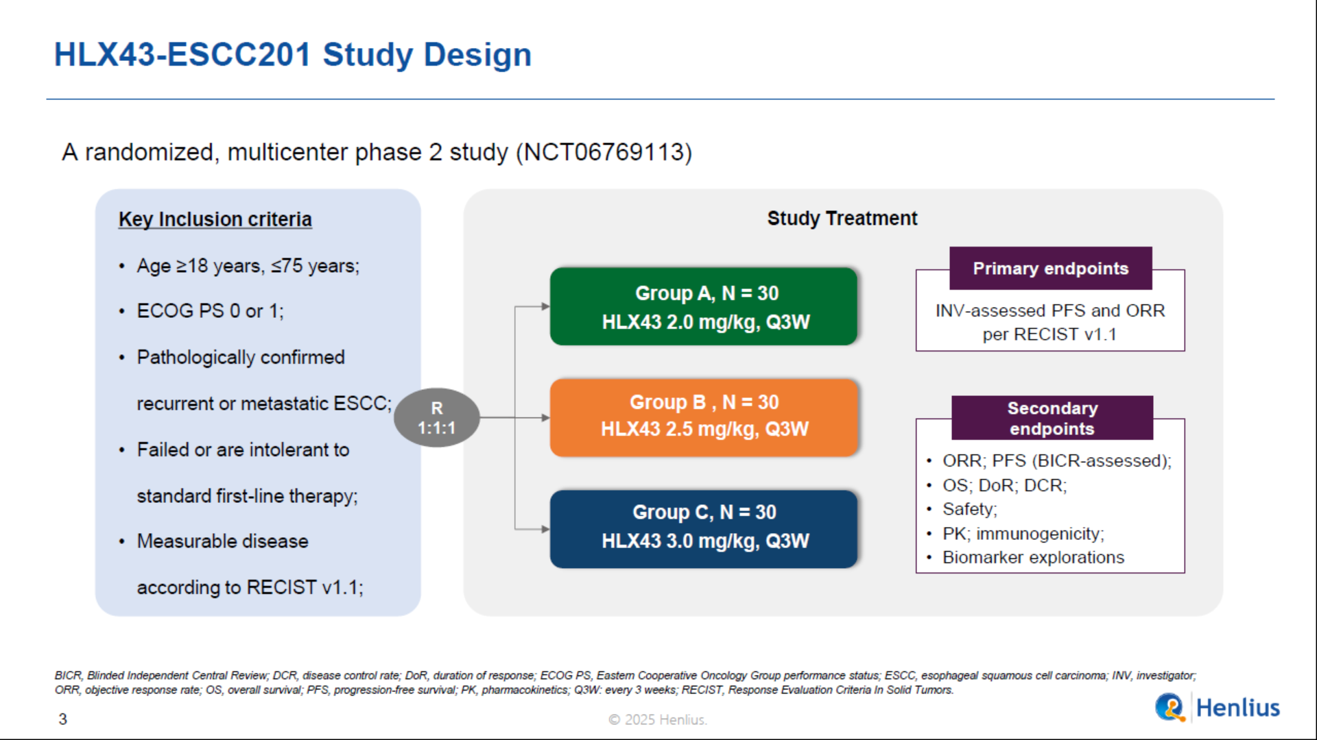 This randomized, multi-center phase 2 study evaluated the efficacy and safety of HLX43 in previously treated recurrent/metastatic ESCC. Patients with histologically or cytologically confirmed recurrent/metastatic ESCC who progressed on or are intolerant to first-line chemoimmunotherapy were enrolled and randomized 1:1:1 to receive intravenous HLX43 at 2 mg/kg, 2.5 mg/kg, or 3 mg/kg once every 3 weeks. The primary endpoints were investigator-assessed objective response rate (ORR) and progression-free survival per RECIST v1.1. Secondary endpoints included other efficacy endpoints, safety, pharmacokinetics, immunogenicity, and biomarker explorations.